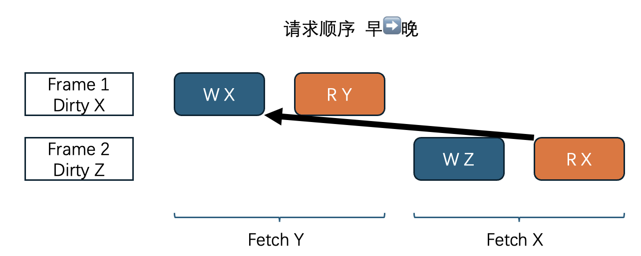 2025.6.21 尝试继续优化无果 首先我想对之前的一些实现细节作补充。我的DiskScheduler为每个frame提供一个后台线程,后台线程处理请求时只需要特殊考虑上面图中的情况,必须要让读读到最新的写(为什么?因为既然Fetch Y先持有bpm大锁并执行了,其他线程得看到Fetch Y的Write X。这里我反思了Fetch Y后续的R Y被其他请求插队执行似乎是无关紧要的,也即似乎不需要在bpm锁持有期间提交请求)。后台线程依序处理同一个frame的请求时需要考虑RAW的情况,即等待其他线程的对同一个page的写完成再读,或者直接从该线程那里偷读。我的DiskScheduler处理线程能处理同一个frame按序提交多个请求的情况,能按序完成。