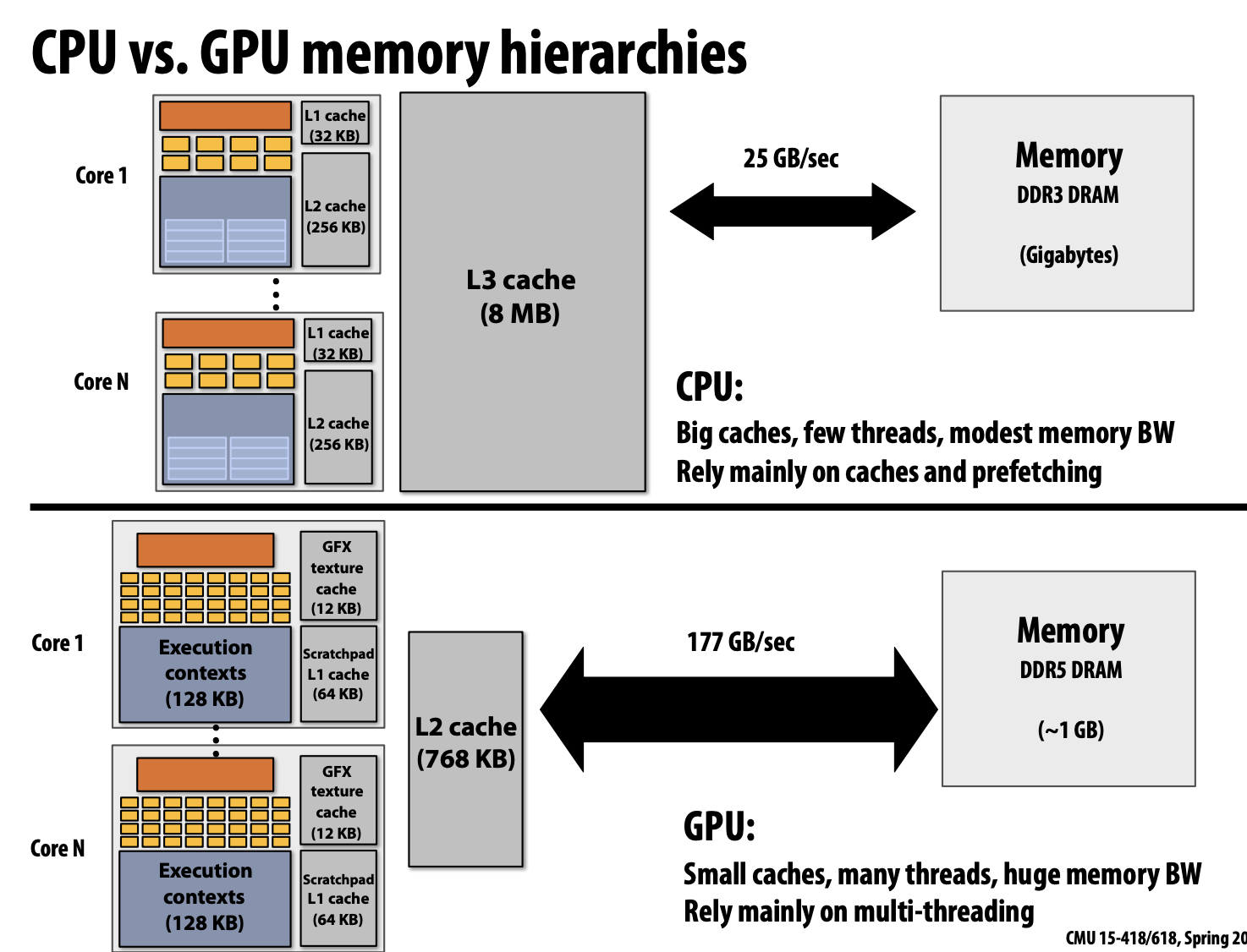 硬件(core)能管理线程(维护多个execution context),通过切换线程执行隐藏内存访问延迟,提高吞吐量